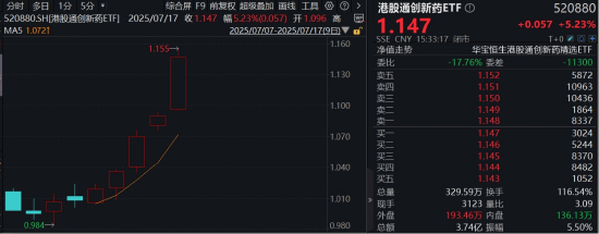 7月17日,港股创新药全天领涨,势如破竹,高纯度+高弹性标的港股通创新药ETF(520880)场内价格一度涨近6%,收涨5.23%,全天成交额3.74亿元,环比放量超两倍,创历史天量!