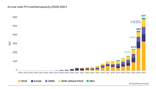 根据欧洲光伏产业协会SolarPowerEurope的《2025-2029年全球光伏市场展望》数据显示,2024年全球光伏新增装机量仅为597GW,相较2023年仅增加33%,增速明显减少。