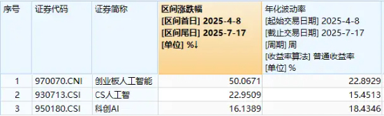 注:统计区间为2025.4.8-2025.7.17,创业板人工智能指数基日为2018.12.28,发布日期为2024.7.11。创业板人工智能指数2020-2024年年度涨跌幅分别为:20.1%、17.57%、-34.52%、47.83%、38.44%,指数成份股构成根据该指数编制规则适时调整,其回测历史业绩不预示指数未来表现。