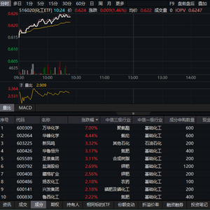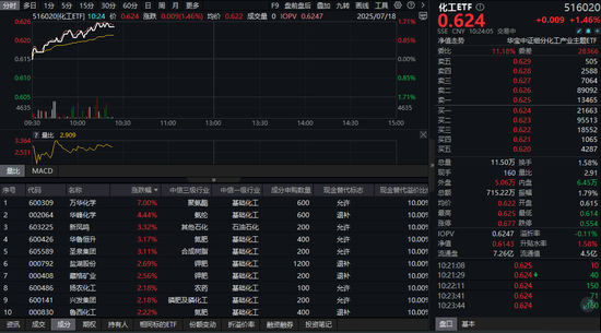 今日(7月18日),化工板块开盘后持续上攻,反映化工板块整体走势的化工ETF(516020)震荡拉升,盘中场内价格最高涨幅达到1.63%。