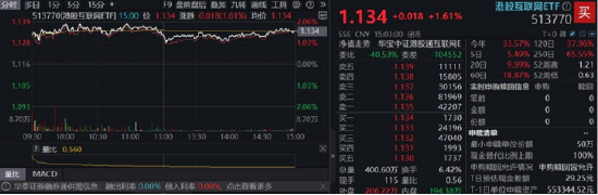 科网板块全天领涨,哔哩哔哩-W涨超4%,阿里巴巴-W涨近3%,快手-W涨超2%,小米集团-W、美团-W涨超1%,腾讯控股跟涨。重仓港股互联网龙头的港股互联网ETF(513770)场内价格一度涨逾2%,收涨1.61%。