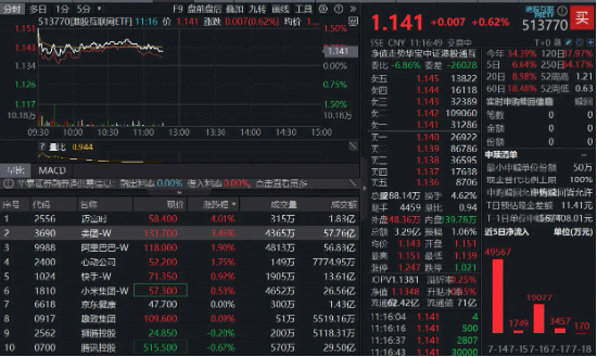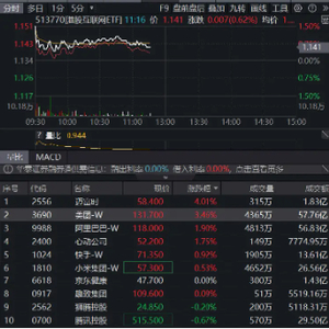 7月21日早盘,港股科网龙头多数走强,截至发稿,美团-W领涨逾3%,阿里巴巴-W涨近2%,快手-W涨超1%,小米集团-W跟涨。重仓港股互联网龙头的港股互联网ETF(513770)场内价格现涨0.62%,实时成交额超3亿元。