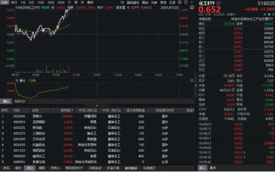 今日(7月22日),化工板块继续猛攻!反映化工板块整体走势的化工ETF(516020)开盘短暂震荡后直线拉升,截至发稿,场内价格涨1.24%。