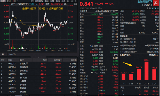 热门ETF方面,规模、流动性同类断层第一的金融科技ETF(159851)盘中多次冲高,场内价格收涨0.12%,守住20日均线,全天溢价交易,成交额达6.87亿元,资金当日净申购2.61亿份。