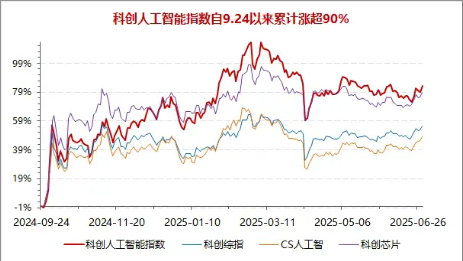 3、收益亮眼,长期领跑:科创板人工智能指数自9.24行情以来,截至6月底,累计上涨90.90%,大幅跑赢科创综指(61.53%)等宽基指数、科创芯片(86.53%)等细分行业指数和中证人工智能主题指数(54.31%)等同类人工智能指数。