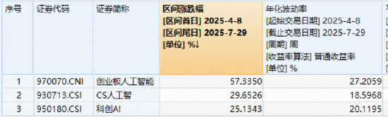 注:统计区间为2025.4.8-2025.7.29,创业板人工智能指数基日为2018.12.28,发布日期为2024.7.11。创业板人工智能指数2020-2024年年度涨跌幅分别为:20.1%、17.57%、-34.52%、47.83%、38.44%,指数成份股构成根据该指数编制规则适时调整,其回测历史业绩不预示指数未来表现。
