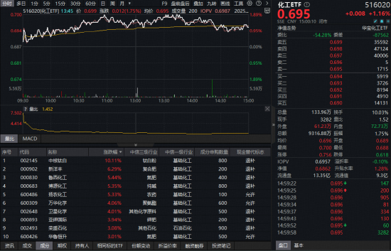 化工板块今日继续猛攻!反映化工板块整体走势的化工ETF(516020)开盘后持续上攻,盘中场内价格涨幅一度达到1.89%,尾盘有所回落,但截至收盘,仍有1.16%的涨幅。