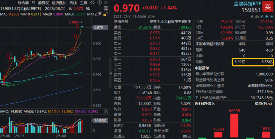 热门ETF方面,规模、流动性同类断层第一的金融科技ETF(159851)盘中一度冲高逾3%,最高触及0.993元(前复权)历史高价,收盘仍涨1.04%,全天放量成交14.83亿元,交易情绪高涨。资金继续布局,159851单日获资金净申购2.37亿份,此前五日累计超6.5亿元资金增持!