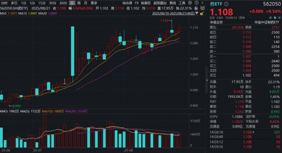 A股制药板块全天飘红,强于大市。全市场唯一跟踪制药指数的药ETF(562050)盘初上探1.45%,场内价格收于1.108元,创上市以来收盘新高!
