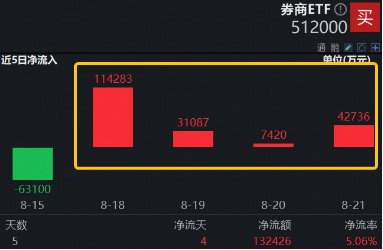 相关ETF亦备受青睐。上交所数据显示,券商ETF(512000)近4日连续吸金,合计获净流入19.55亿元。