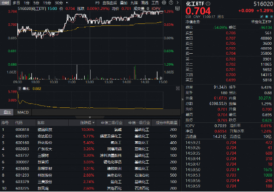 化工板块今日(8月22日)继续猛攻,氯碱、磷肥及磷化工、氟化工等板块部分个股领涨!截至收盘,航锦科技涨停,宏达股份、巨化股份双双大涨超5%,广东宏大、三棵树、新宙邦等多股涨超3%。反映化工板块整体走势的化工ETF(516020)全天几乎单边上行,最终场内价格收涨1.29%,收于日内高点,日线三连阳。