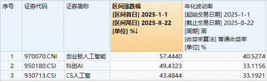 注:统计区间为2025.1.1-2025.8.22,创业板人工智能指数基日为2018.12.28,发布日期为2024.7.11。创业板人工智能指数2020-2024年年度涨跌幅分别为:20.1%、17.57%、-34.52%、47.83%、38.44%,指数成份股构成根据该指数编制规则适时调整,其回测历史业绩不预示指数未来表现。