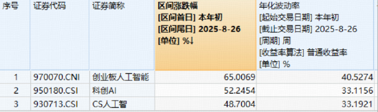 注:统计区间为2025.1.1-2025.8.26,创业板人工智能指数基日为2018.12.28,发布日期为2024.7.11。创业板人工智能指数2020-2024年年度涨跌幅分别为:20.1%、17.57%、-34.52%、47.83%、38.44%,指数成份股构成根据该指数编制规则适时调整,其回测历史业绩不预示指数未来表现。