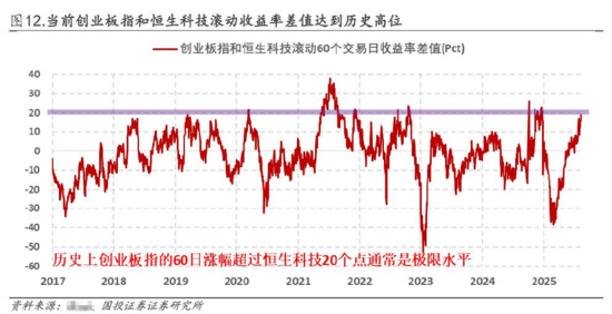 根据国投证券回溯数据,从60日滚动收益率差值来看,历史上创业板指和恒生科技两者存在明确交替轮动关系,当创业板指涨幅领先恒生科技20pct时,多数意味着恒生科技相对收将迎来补涨(例外情况是2021 年机构极致抱团行情,由于新能源导致产业基本面相差太大导致收益率差值扩大至30pct 以上)。国投证券提示:同样具有“机构重仓”和“反杠铃策略”属性恒生科技,在创业板指大幅领涨接近新高的背景下有望迎来补涨。