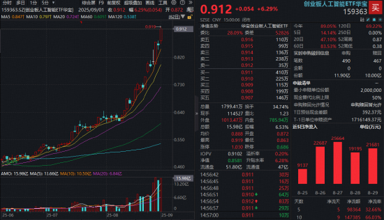 热门ETF方面,同标的指数规模最大、流动性突出的创业板人工智能ETF(159363)全天强势拉升,场内价格收涨6.29%再创上市新高,环比放量成交15.98亿元!资金继续净申购1.9亿份,此前十日已有累计超14亿元资金火爆增持,表明对创业板人工智能赛道的长期信心。