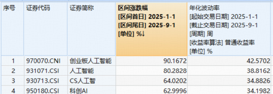 注:统计区间为2025.1.1-2025.9.1,创业板人工智能指数基日为2018.12.28,发布日期为2024.7.11。创业板人工智能指数2020-2024年年度涨跌幅分别为:20.1%、17.57%、-34.52%、47.83%、38.44%,指数成份股构成根据该指数编制规则适时调整,其回测历史业绩不预示指数未来表现。