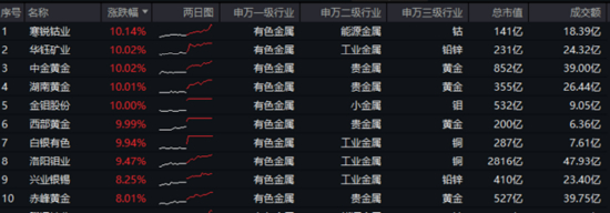 成份股方面,黄金龙头中金黄金、湖南黄金、西部黄金强势涨停!此外,华钰矿业、金钼股份、白银有色亦涨停,寒锐钴业涨超10%,洛阳钼业、兴业银锡、赤峰黄金等个股大幅跟涨。