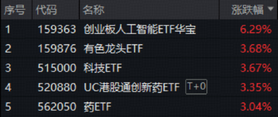 盘面上,光模块等算力硬件方向继续走强,“易中天”持续推升再创历史新高,创业板人工智能ETF(159363)场内价格收涨6.29%再创上市新高;有色金属板块延续凶猛涨势,有色龙头ETF(159876)场内价格猛拉3.68%,上探2021年9月以来的高点;医药板块再度发力,港股通创新药ETF(520880)、药ETF(562050)场内价格双双涨超3%;港股AI终于迎来行情启动迹象,港股互联网ETF(513770)场内价格收涨1.7%,重返所有均线上方。
