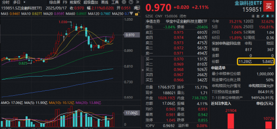 热门ETF方面,同类规模超百亿、流动性断层第一的金融科技ETF(159851)放量上攻,场内价格收涨2.11%,站上所有重要均线!单日成交超17亿元,交投环比接近翻倍!买盘资金汹涌,盘中持续溢价,单日资金净申购5.44亿份,表明对金融科技板块后市信心!