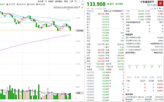 十年国债ETF(511260)今日下跌0.16%,近5日跌幅0.44%,延续先前的弱势。