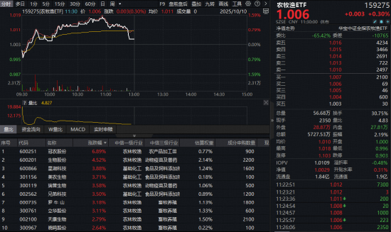 农牧渔板块今日(10月10日)表现强劲。全市场首只农牧渔ETF(159275)早盘低开后迅速拉升翻红,盘中场内价格涨幅一度达到1.5%,截至午间收盘,涨0.3%。