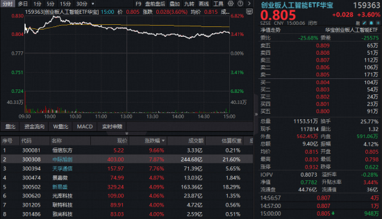 创业板人工智能高“光”回归!1.6T光模块需求上调,中际旭创涨近8%交投登顶,159363放量上攻3.6%