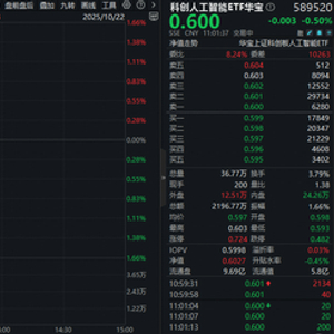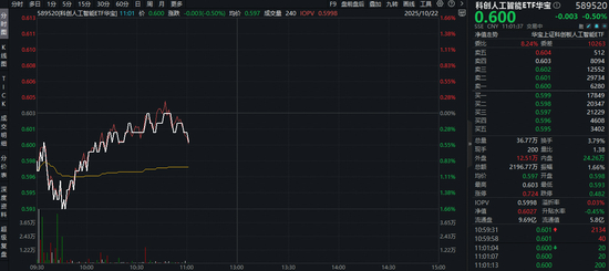 盘面上,今日(10月22日)重点布局国产AI产业链的科创人工智能ETF(589520)随市盘整回调,场内价格现跌0.50%。