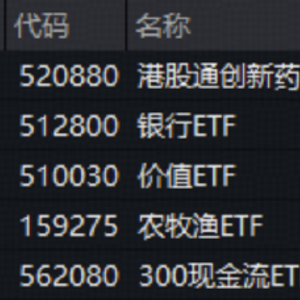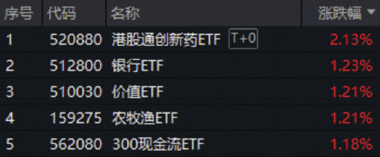 盘面上,创新药行情继续爆发,高弹性港股通创新药ETF(520880)场内最终收涨2.13%,领跑全市场医药类ETF;银行重拾攻势,顶流银行ETF(512800)场内价格收涨1.23%,一举收复5日、10日两根均线,聚焦“高股息+低估值”大盘蓝筹股的价值ETF(510030)亦持续上攻,最终场内价格上探1.3%;或受生猪价格回升影响,农牧渔板块全天强势,全市场唯一农牧渔ETF(159275)场内价格收涨1.21%。