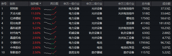 细分方向来看,电力设备显著领涨,光伏龙头阿特斯20CM涨停,天合光能涨逾11%,阳光电源、晶科能源大幅跟涨;电池龙头亿纬锂能涨超7%,宁德时代、中伟股份涨逾2%。