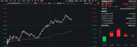 今日(11月5日)午后,创业板指领涨主要指数,百分百布局新质生产力的硬科技宽基——双创龙头ETF(588330)场内价格盘中涨超1.2%,现涨0.88%。值得关注的是,上交所数据显示,该ETF近4日连续吸金,合计金额4526万元,反映抄底科技资金稳步加仓!