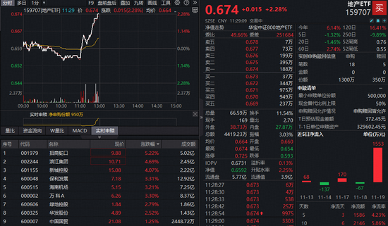 热门ETF方面,全市场唯一跟踪中证800地产指数的地产ETF(159707)午前直线拉升,场内领涨超2%,资金净申购950万份。