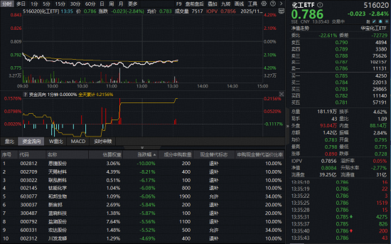 成份股方面,锂电、钛白粉、磷化工等板块部分个股跌幅居前。截至发稿,恩捷股份跌停,天赐材料大跌超8%,联泓新科、钛能化学、和邦生物等多股跌超6%,拖累板块走势。