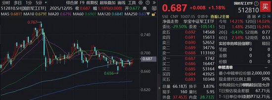 12月5日,国防军工延续反弹势头,场内热门的国防军工ETF(512810)场内价格续涨逾1%,收复半年线。商业航天概念继续活跃,航天科技涨停。