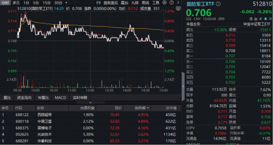 高人气国防军工ETF(512810)汇聚海陆空天军工核心资产,盘初一度涨超1%创阶段新高,而后震荡回落,最终小幅收跌0.28%,表现显著好于大市。全天成交8105万元,较上日放量逾两成。