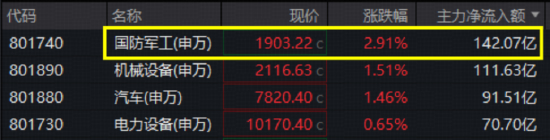 资金面上,主力延续猛烈攻势,单日净买入国防军工行业再超百亿,达142亿元,高居全行业(申万)首位。