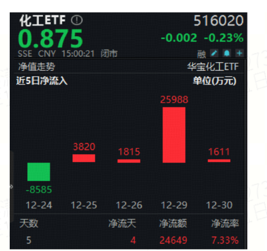 资金面上,化工板块场内热门布局工具化工ETF(516020)近期频频吸金。数据显示,截至昨日(12月30日)收盘,化工ETF(516020)近5个交易日中有4个交易日获资金净申购,合计净申购额高达2.46亿元。