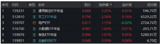 盘面上,商业航天卷土重来,狂掀涨停潮,航天发展、中国卫星、航天电子集体涨停,携手挺进A股成交额前五榜单!相关热门通用航空ETF华宝(159231)劲涨3.25%创历史新高,军工ETF华宝(512810)亦创逾3年新高。