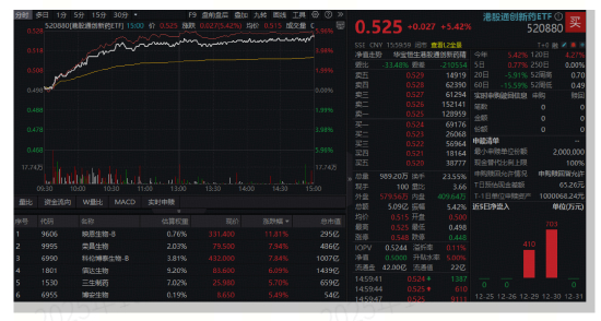 港股市场上,医药板块全天领跑,创新药尤为强势,纯度100%的港股通创新药ETF(520880)尽显高弹性,劲涨5.42%收于日内高点,创2025年7月上市以来最大单日升幅!成交5.09亿元,环比放量逾263%!