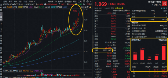 ETF继续放量突破上市高点,或为买点信号,资金持续进场抢筹!数据显示,有色ETF华宝(159876)全天获资金净申购5460万份,此前5日连续获资金净流入,合计金额9749万元。