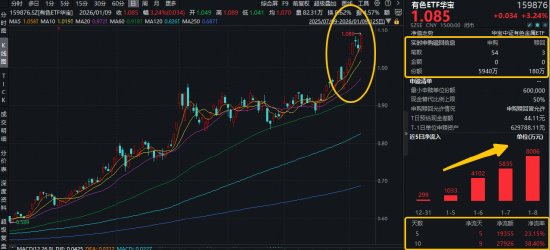 ETF放量突破上市高点,或为资金买点信号!伴随火热上涨的行情,资金积极涌入!有色ETF华宝(159876)全天获资金净申购5760万份,此前5日资金净流入呈现逐日增长态势,合计净流入1.94亿元,拉长时间来看,近10日狂揽2.79亿元!