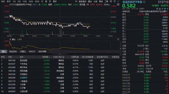1月16日,食品饮料板块继续回调,反映板块整体走势的食品饮料ETF华宝(515710)开盘后持续走弱,截至发稿,场内价格跌0.85%。
