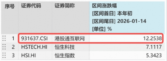 可以看到,开年以来,互联网板块一马当先,引领港股开门红行情。截至1月14日,港股互联网ETF(513770)跟踪的中证港股通互联网指数年内累计上涨12.25%,明显跑赢恒生科技指数表现(7.11%)。