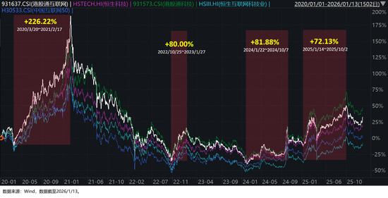 这其中,白色显示的港股互联网ETF(513770)标的指数中证港股通互联网的高弹性特征最为显著,这也使得其在历次上涨行情中的表现都较为出色: