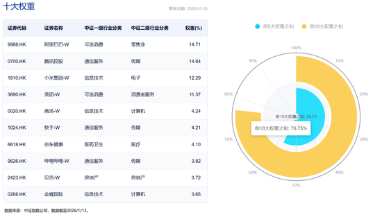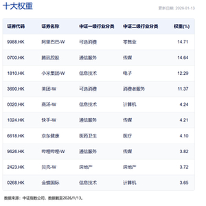 截至2026年1月13日,该指数重仓的均为港股科技中的互联网龙头个股,其中前三大重仓阿里巴巴-W、腾讯控股、小米集团-W权重占比分别高达14.71%、14.64%和12.26%,而前十大重仓更是汇聚了AI云计算、大模型+各领域AI应用公司等,合计权重占比超过76%,龙头优势显著。