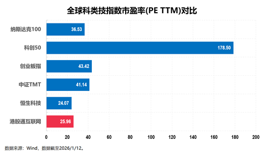 横向对比其他市场科技指数来看,截至2026年1月12日,港股科技代表指数港股通互联网指数的市盈率(PE TTM,下同)仅25.96倍,与同样代表港股科技的恒生科技指数基本持平,远低于美股科技代表指数纳斯达克100指数的36.53倍,也远低于A股科技的代表指数创业板指的43.42倍(类似的还有中证TMT指数的41.14倍),更不要说科创50指数178.50倍的高估值水平了。