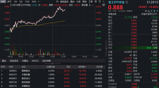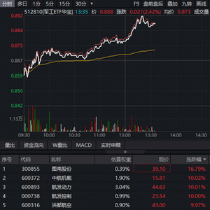 1月19日午后,中航系掀涨停潮,带动军工板块快速上行,军工ETF华宝(512810)冲高2.88%一举收复两根均线!中航机载、航发动力、航发控制、洪都航空等中航系龙头股集体涨停。