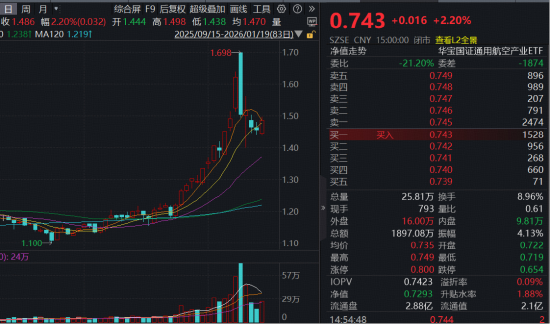 1月19日,商业航天在上周的剧烈波动后迎来强劲反弹。一键布局商业航天+卫星导航+低空经济+大飞机的通用航空ETF华宝(159231)开盘后一路震荡走强,午后一度涨超3%,最终收涨2.20%,强势收复10日均线,并触及5日均线。单日成交额1897万元,较前一交易日放量明显。