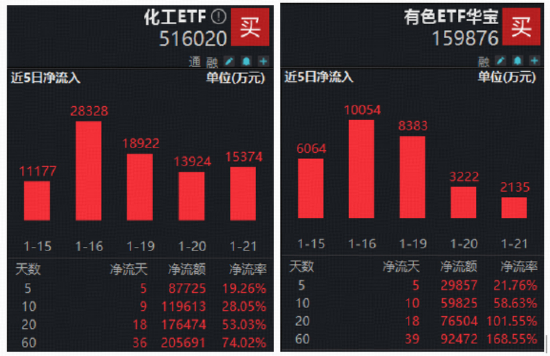 顺周期方面,随着“反内卷”政策逐步深化,CPI触底回升,顺周期板块整体表现比较强劲,化工产品掀涨价潮,化工ETF(516020)场内价格拉升1.14%,近5日连续吸金8.77亿元。格陵兰岛地缘紧张局势出现明显缓和,金价跳水,黄金股领跌,有色ETF华宝(159876)场内价格一度跌近2%,最终收跌0.69%,资金或看好有色金属板块后市表现,逢跌进场抢筹,该ETF全天获资金净申购4140万份。
