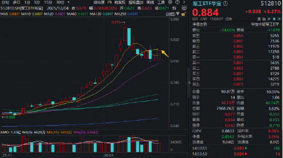 高人气军工ETF华宝(512810)全天高位运行,放量涨3.27%收于日内高点,日线成功连阳,成交7968万元,较上日大增三成。
