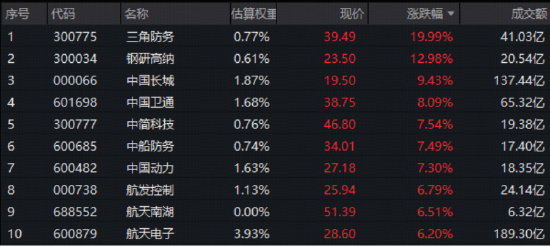军工ETF华宝(512810)覆盖80只军工龙头股,74股收红。三角防务20CM涨停,钢研高纳涨近13%,中国长城继昨日涨停后爆量再涨9.43%,航天电子大涨6.2%,成交189.3亿元跻身A股成交额前三。